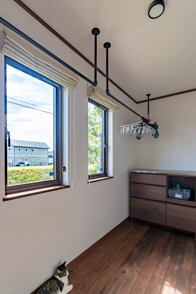 2階の陽当たりの良いホールを広げて、ランドリースペースに。共働きで夜に洗濯物を干したい家庭にも大助かりです。