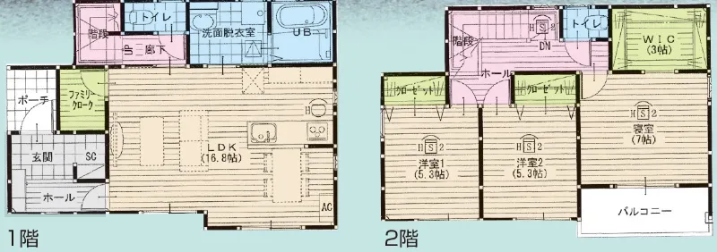 LDKを中心に家族が自然と集まる設計としながら、2階にプライベート空間を確保。シューズクロークやファミリークローク、ウォークインクローゼットなど収納も充実しています。