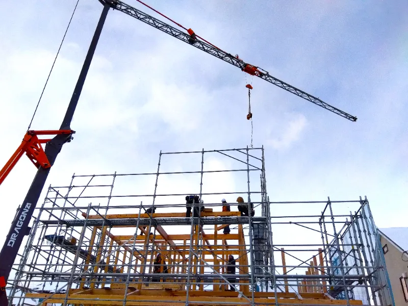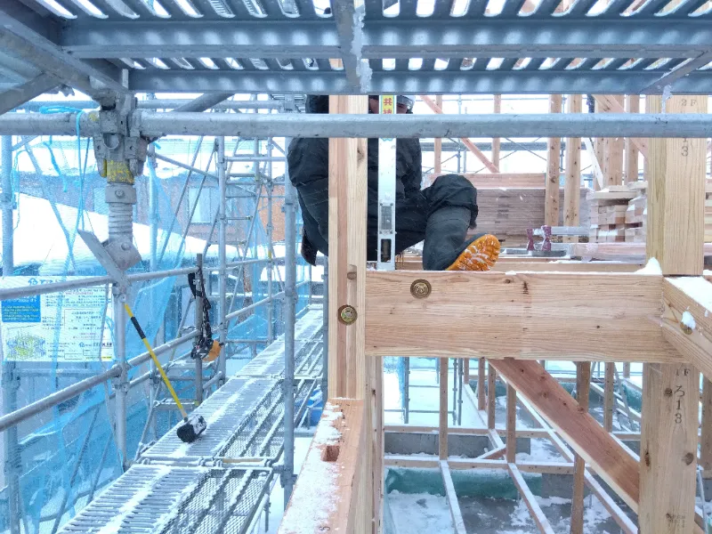 柱の垂直を確認しながら、仮筋違いで仮止めしていきます。