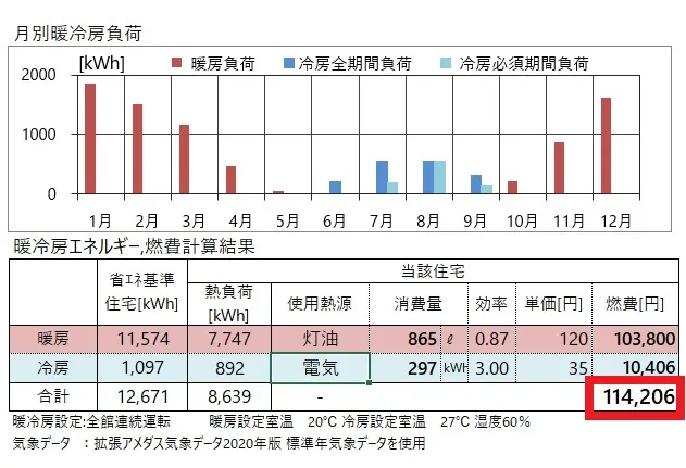 冬は灯油のストーブ、夏はエアコンの冷房を使用した場合に、 年間で約11万4千円掛かる計算になります。