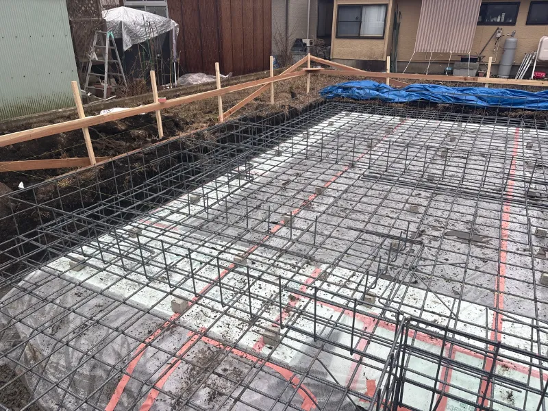 防湿シートをかぶせて鉄筋を組み立てて行きます!!