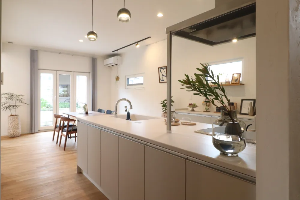 カップボード側にも二つの窓があり、自然光がたっぷり入る明るいキッチンで毎日の料理が楽しくなる空間。