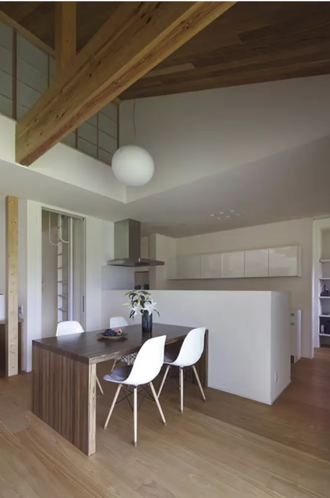 リビングの天井は小屋吹抜けで、実際以上の広がりを感じる