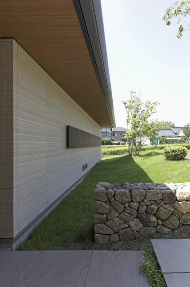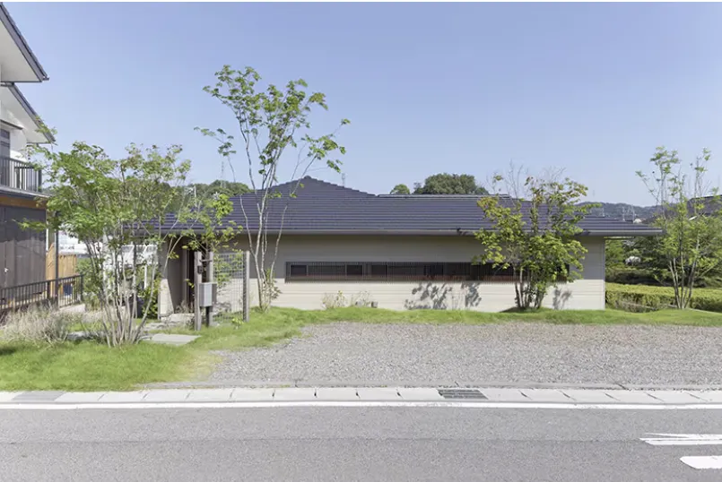 水平ラインを強調した外観。細長い窓に設けた縦格子飾りがアクセントに