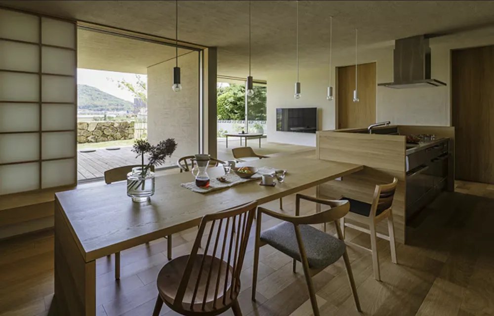 リビングは、海へ開く大きな窓側の天井高を、 デッキの軒の高さと揃え、視線がスムーズに外へと導かれる。