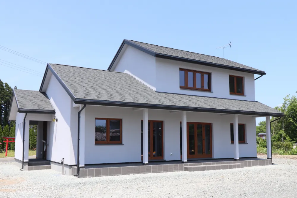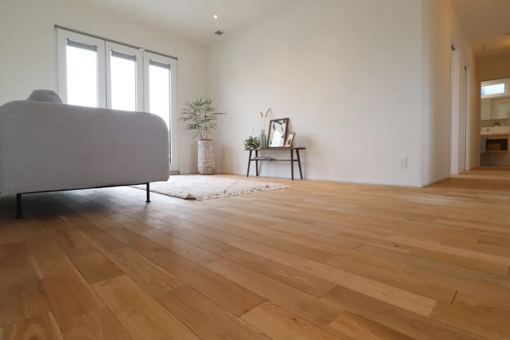 重厚感と美しさが共存する、理想の平屋スタイル。シャープな屋根のラインと、スペイン漆喰の外壁が印象的な平屋の外観で等間隔に並んだ高性能窓が洗練された雰囲気を醸し出しています。平屋ならではのどっしりとした安定感と、自然素材の温かみが融合した、街並みに美しく映える佇まいです。
