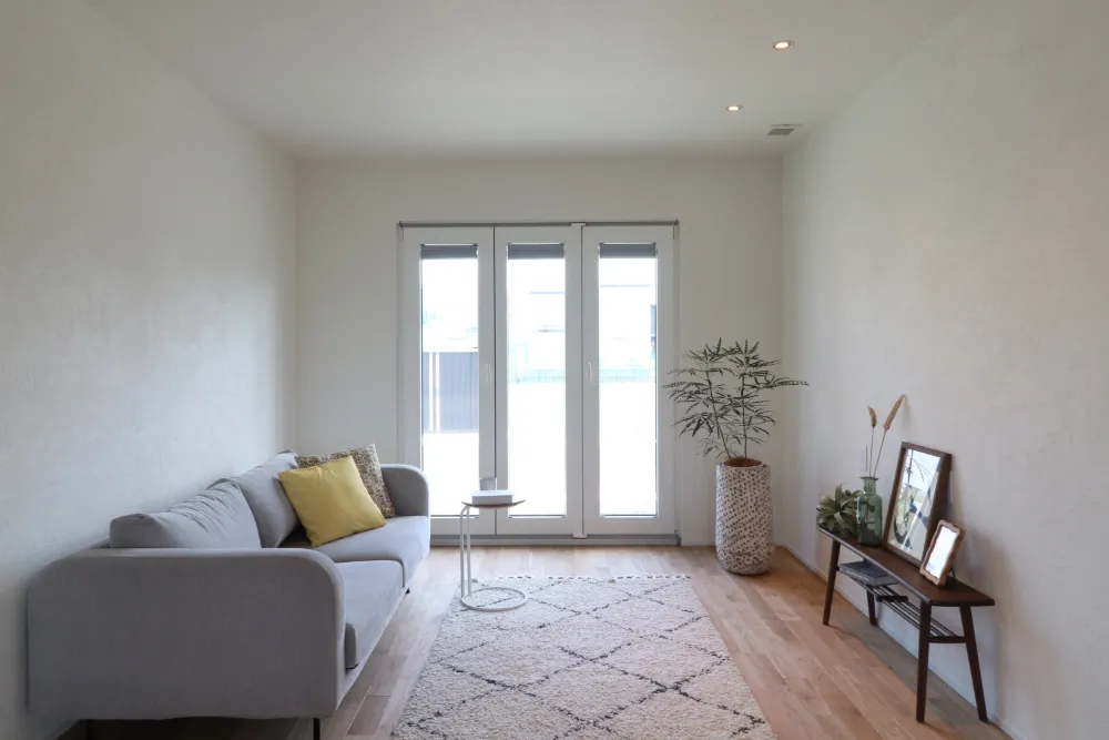 4枚のフォールディング窓からたっぷりの光が差し込む、明るく広々としたLDK。 ホワイトカラーのスペイン漆喰仕上の壁が光を拡散し、お部屋全体を柔らかな空気感で包みます。