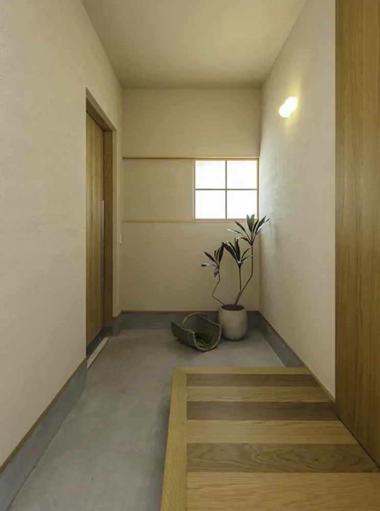 木製の引き戸を開けると、たちまち清々しい木の香りに包まれる玄関ホール。南の小窓には障子が施され、柔らかな光が差し込みます。