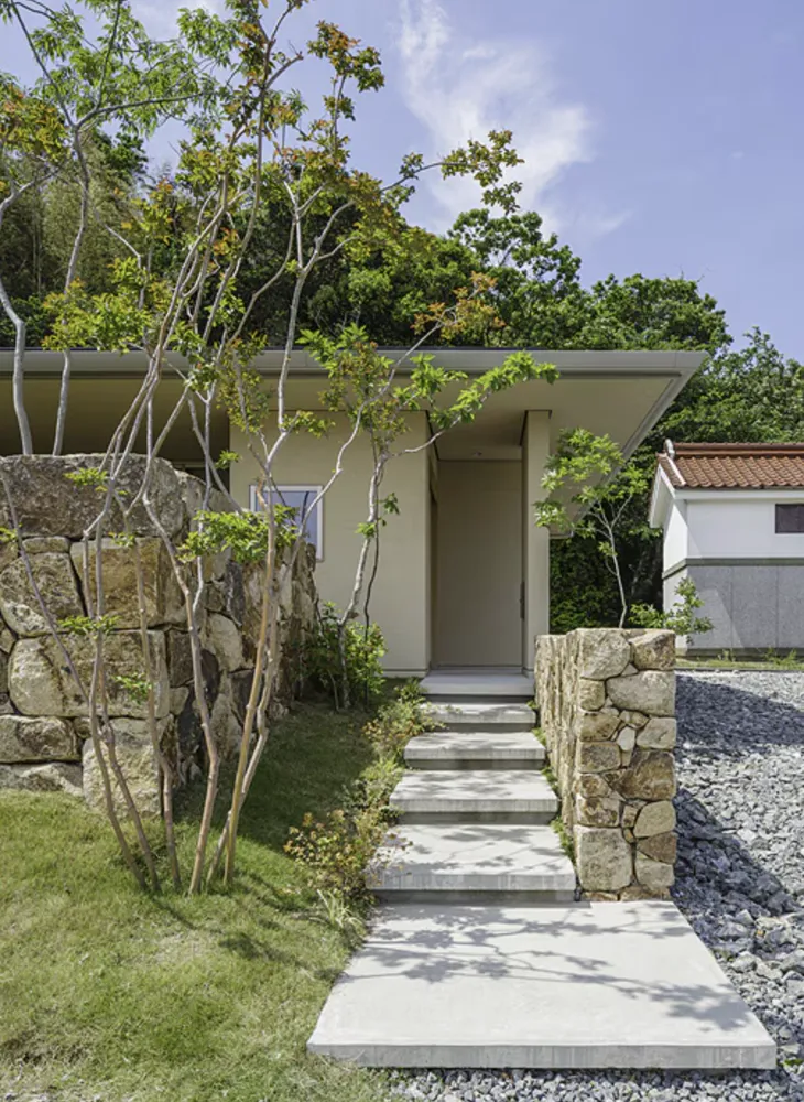 玄関へは石垣の間を縫うようなアプローチを通って。庭には芝が敷かれ、ご夫婦が自ら選ばれたイロハモミジやサルスベリ、ヤマツツジなどが植えられています。