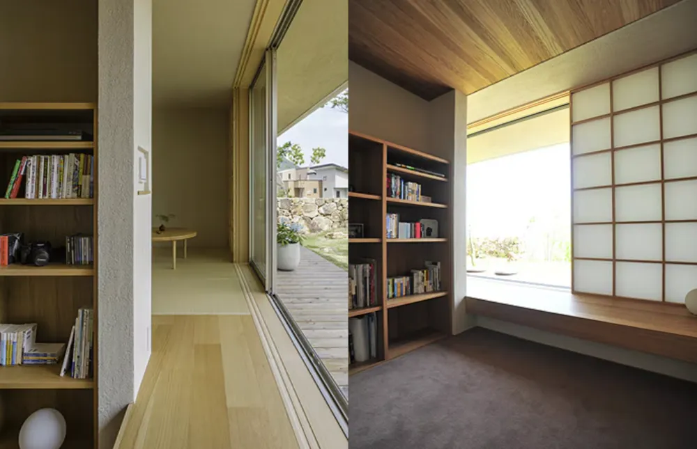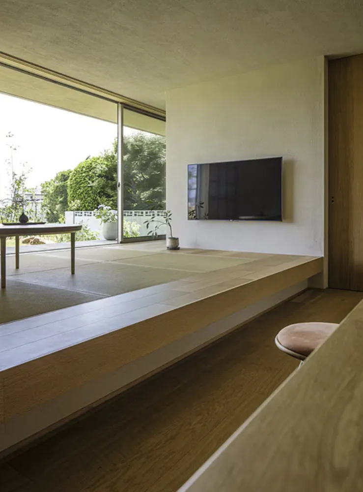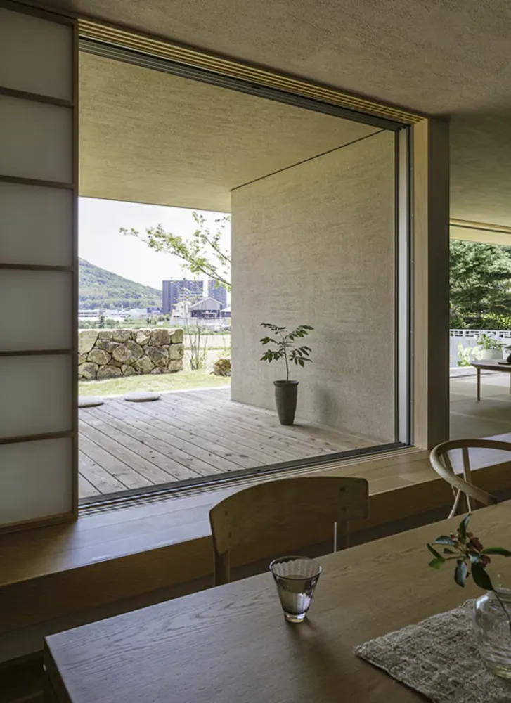 ロケーションは、南側が畑で見通しが良いので、その特性を存分に生かすように考えました。家の中は床や天井の高さを操作して、緩やかに空間を仕切るとともに、開放感や包まれる感覚を使い分けています。また開口部の形や位置を計算し、額縁のように自然を切り取ることで、外からの視線をきにすることなく景色を楽しめるようにしました。ゆったりとした時間に身を委ねられるよう、自然素材にもこだわっています。
