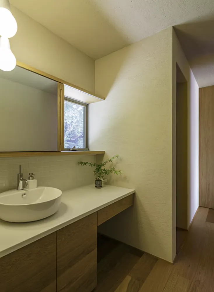 洗面室も木製のカウンターで、温かみのある印象に。窓から覗く緑も、爽やかな自然の中にいることを感じさせます。