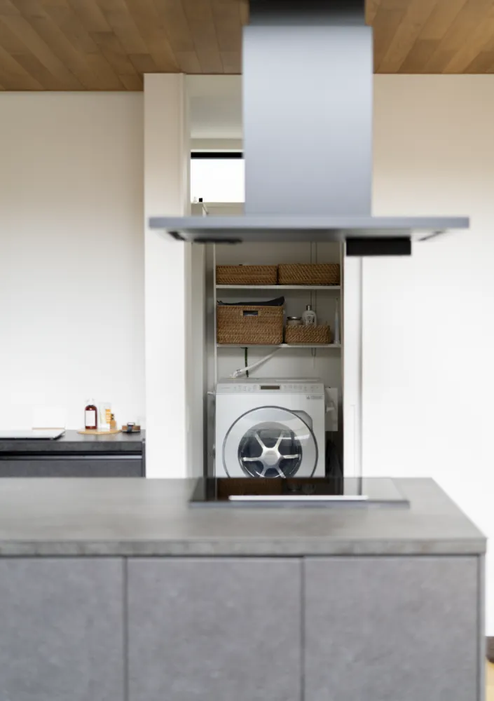 担当者:共働きで忙しいS様ご夫婦。キッチンの背面の扉からはファミリークローゼットがあるサニタリーにつなげ、洗濯・収納が1か所でまとめられる動線に。回遊も可能で、効率よく家事ができるよう設計しました。