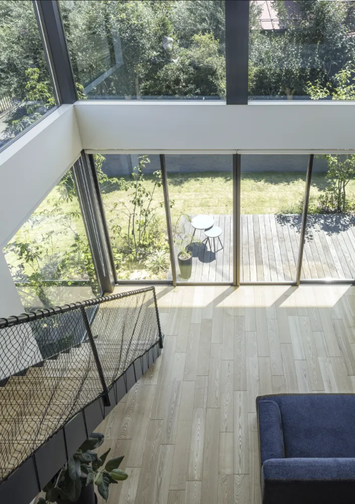 担当者:S様は寒い地域にお住まいですが、コーナーにまたがった2層の大開口と吹き抜けでも、冬も暖かく過ごせているとのことです。積水ハウスの高い断熱技術だからこそ、快適性と開放感を両立できました。