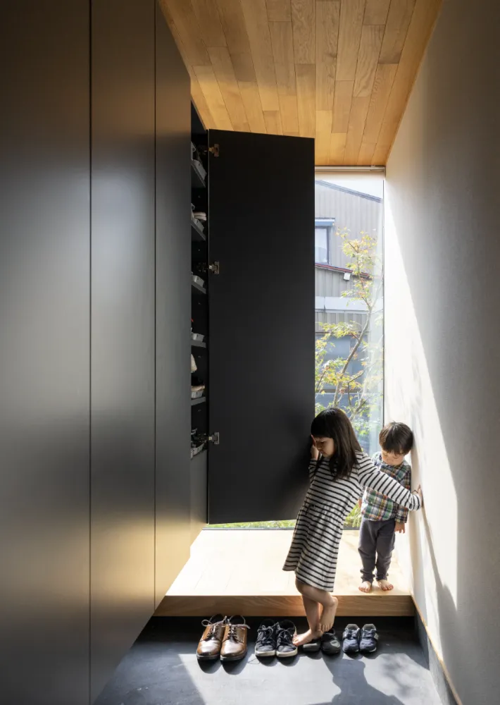 S様:玄関に入ると、その奥の窓から庭の緑が目に飛び込んでくるので、ドアを開けるたびに「幸せ!」と思える空間です。すごく広いわけではないですが、造作の収納があるのでたっぷり靴も入れられています。