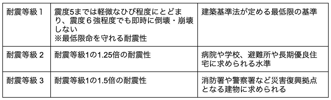 この耐震性能は、等級1から等級3までの3段階に分かれており、数値が高いほど耐震性が高いということになります。それでは、耐震等級の内容を見ていきましょう。