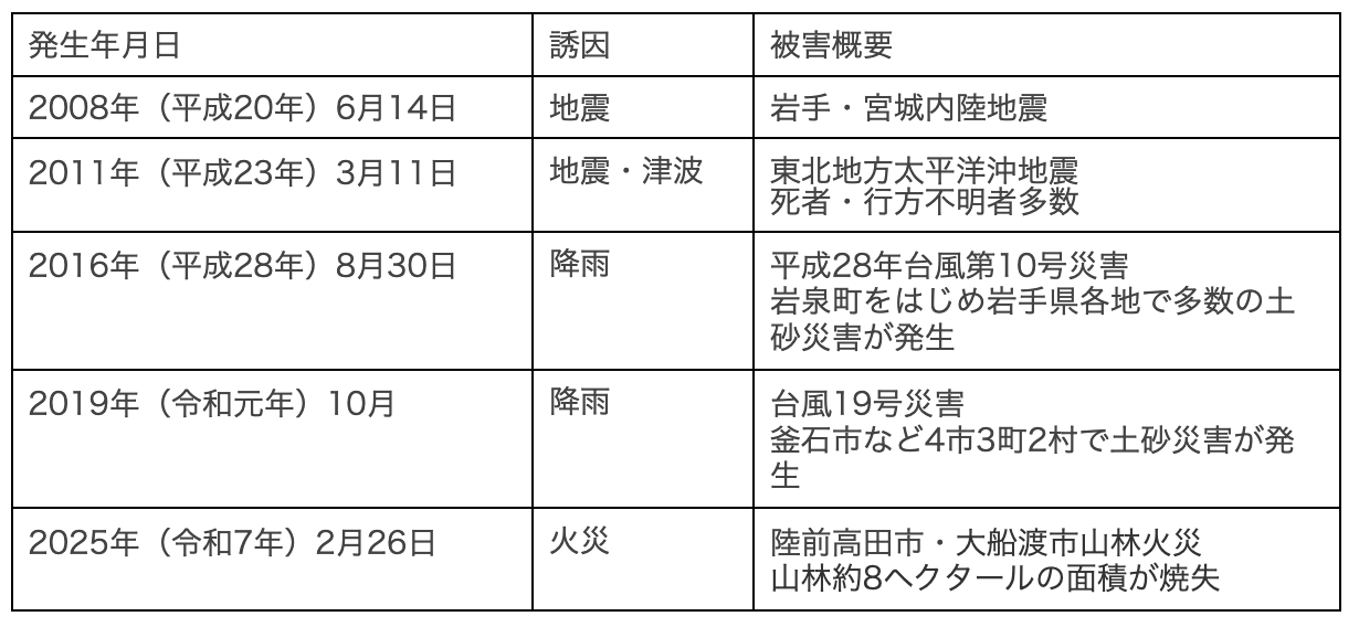まずは、岩手県でこれまでに起きた過去の災害履歴を確認してみましょう。以下は、2000年以降に起きた岩手県の自然災害の一例です。