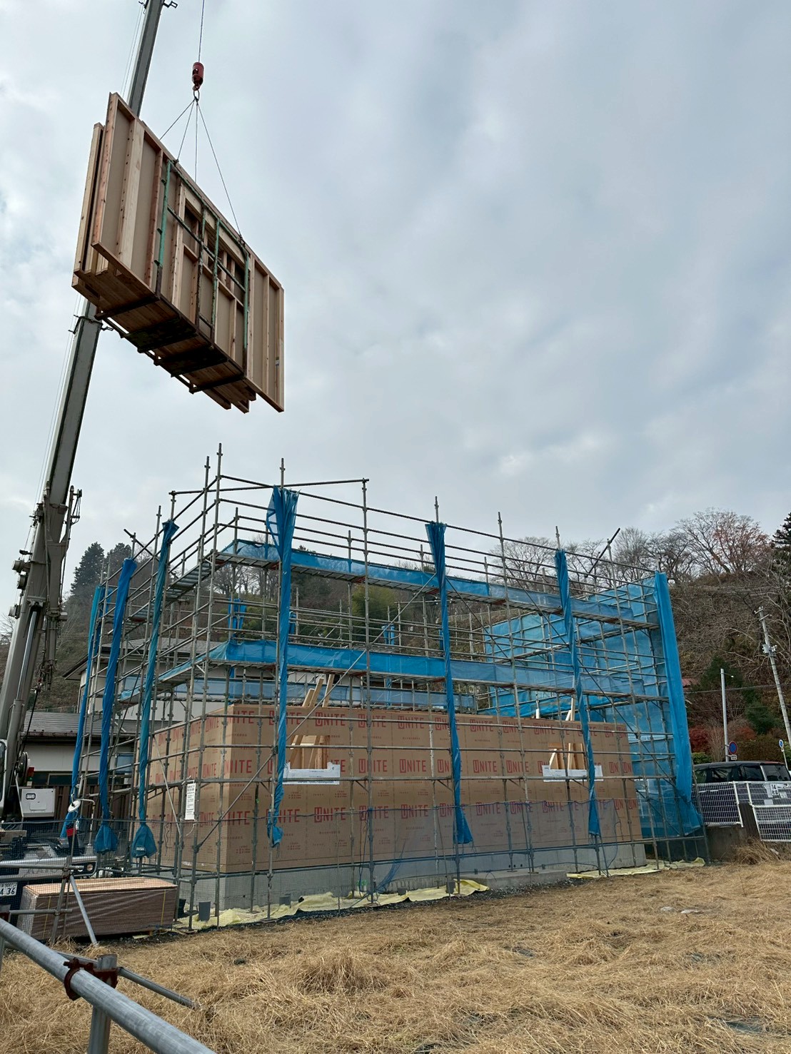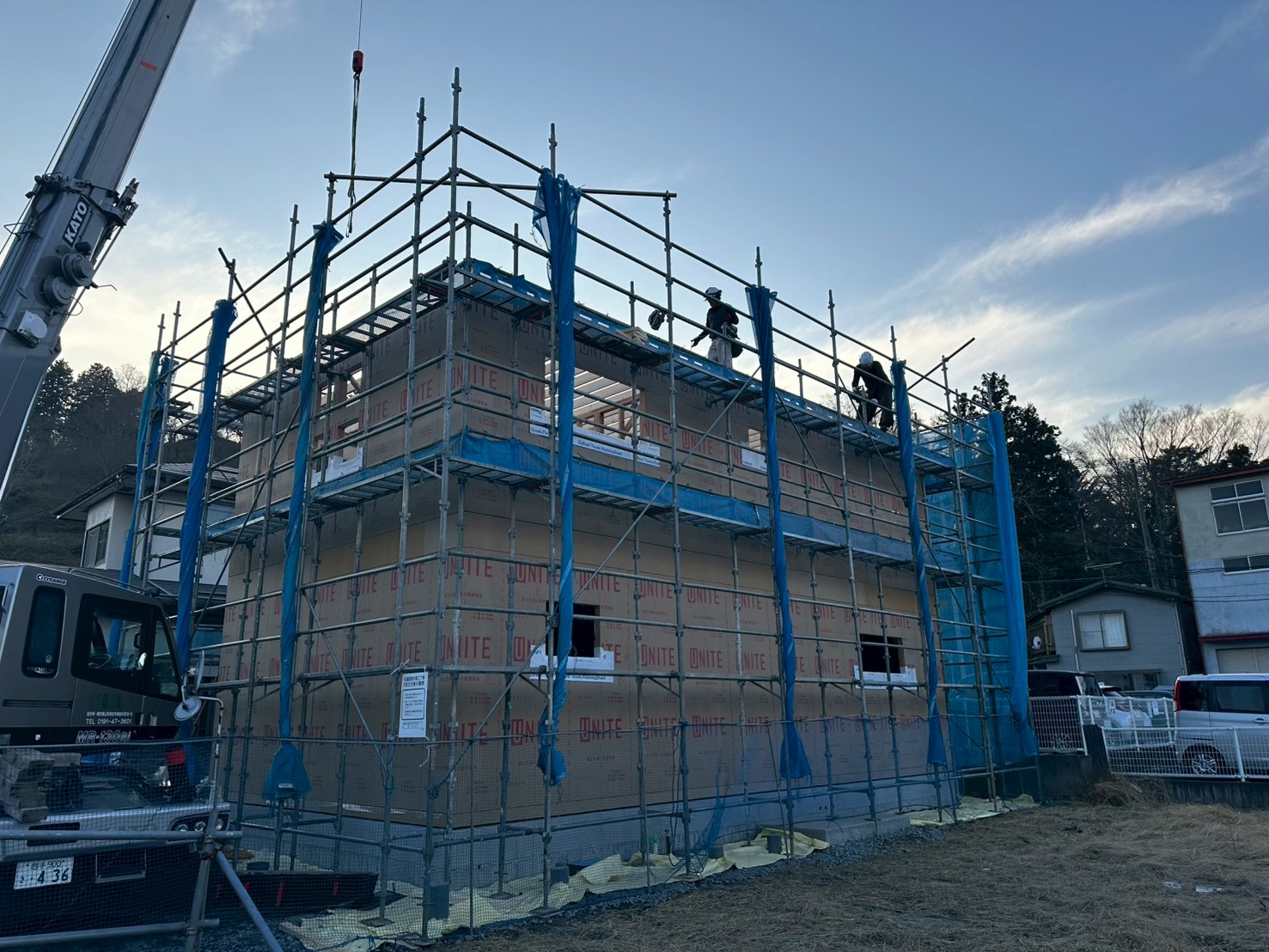 明日は屋根上げの作業を予定しており、これにより建て方工程が完了いたします。