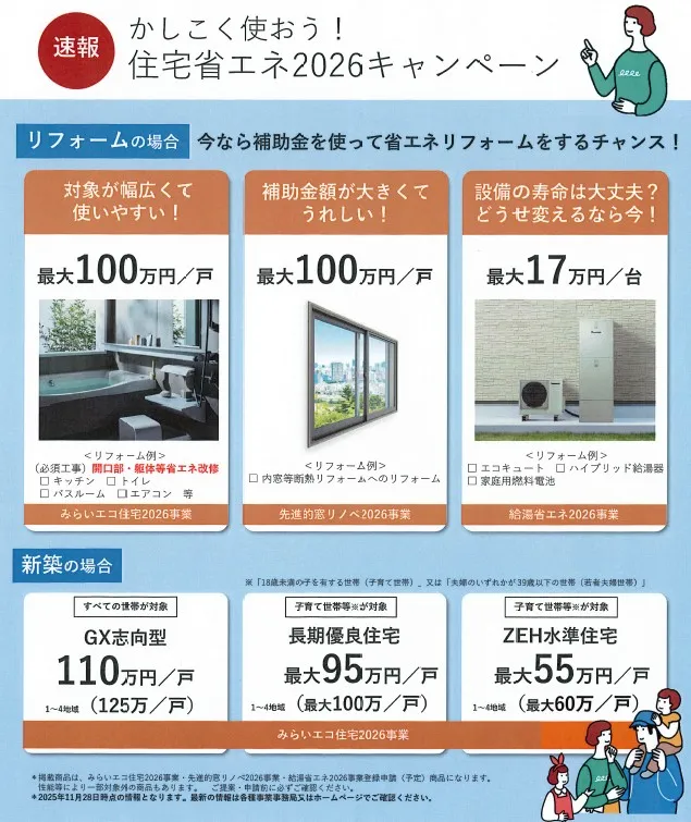 「住宅省エネ2026キャンペーン」の補助金制度を活用できる場合があります。