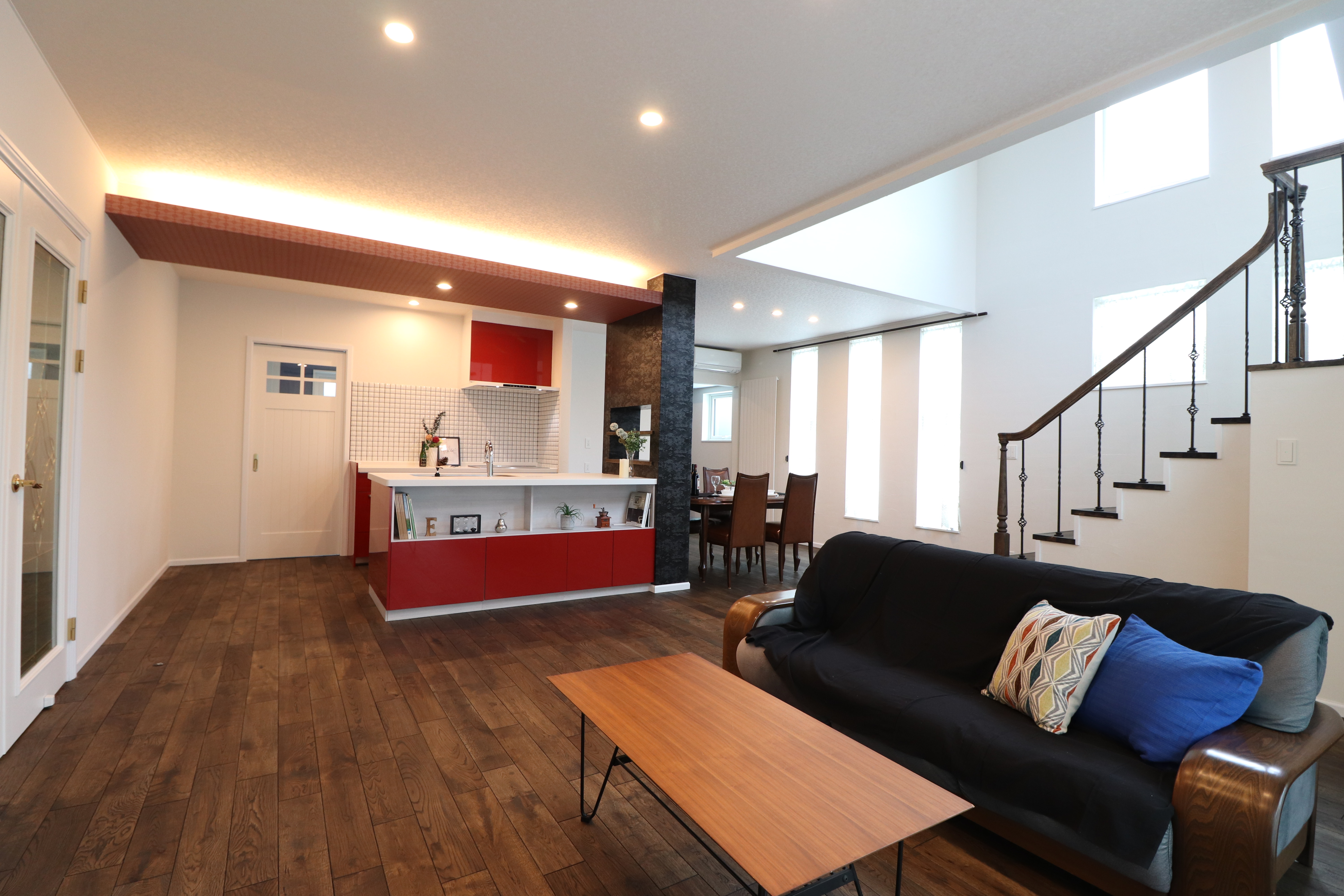 大空間のLDKはブラックを基調にキッチンや下がり天井にレッドが映える