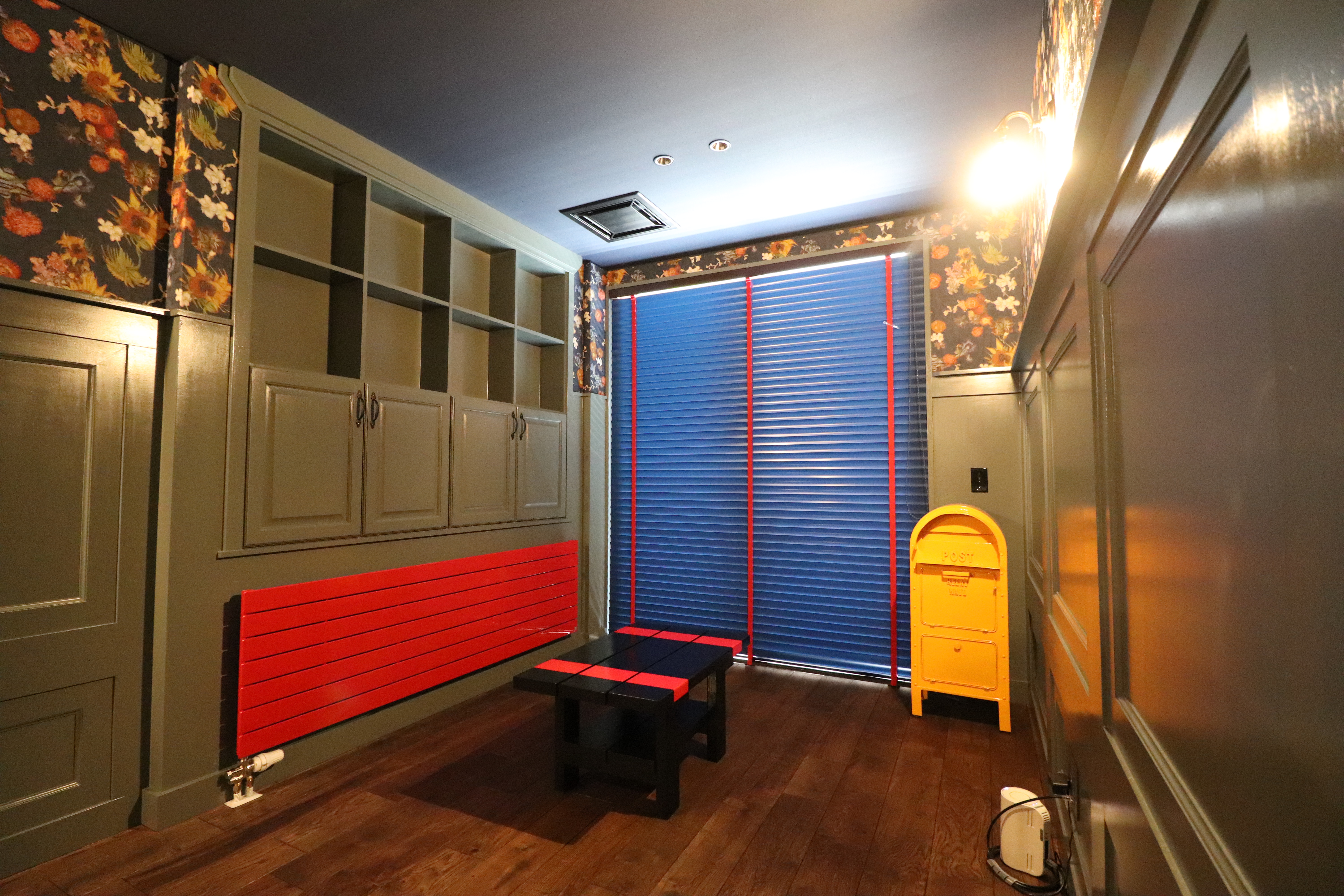 2階はイングランドスタイルの仕上がりで、グリーングレーの壁パネルに、