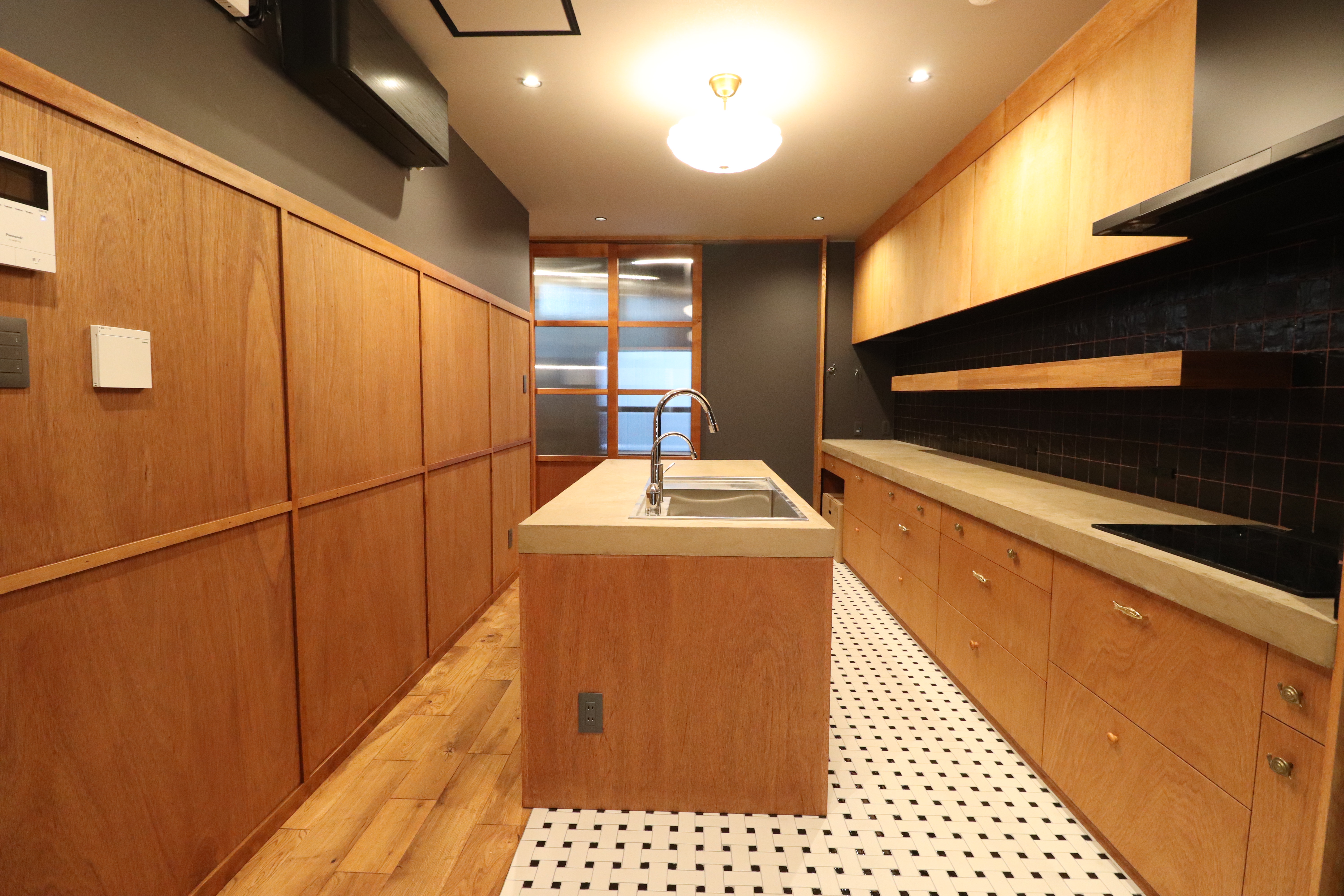 1階はキッチン、洗面台などオーダーで造作し、ラワン材を豊富に使った内装で
