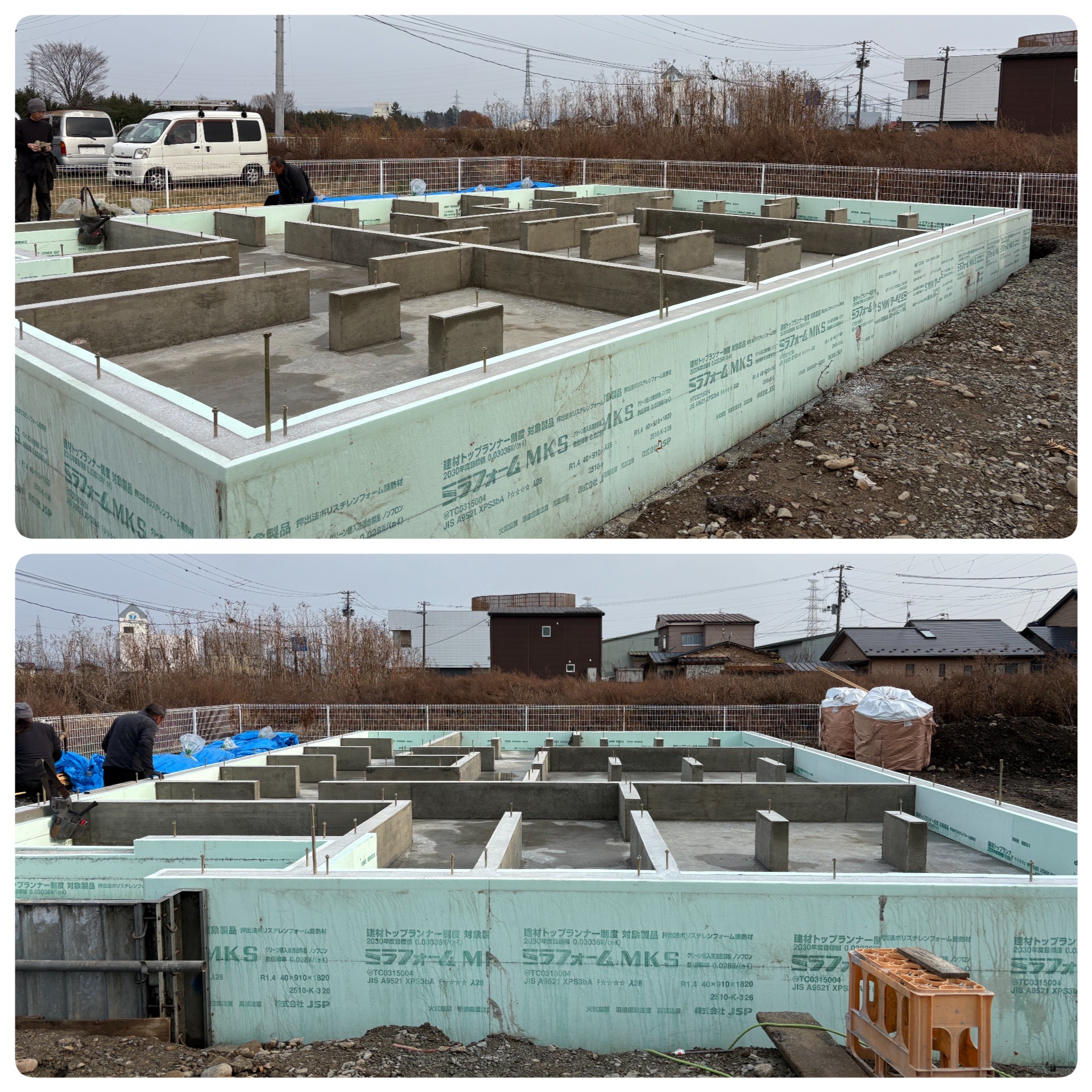 週間天気予報でも、晴れマークがついてる日があまりなく、すっきりしない天候ですが、基礎工事は順調に進んでいます。型枠バラシが完了しました。