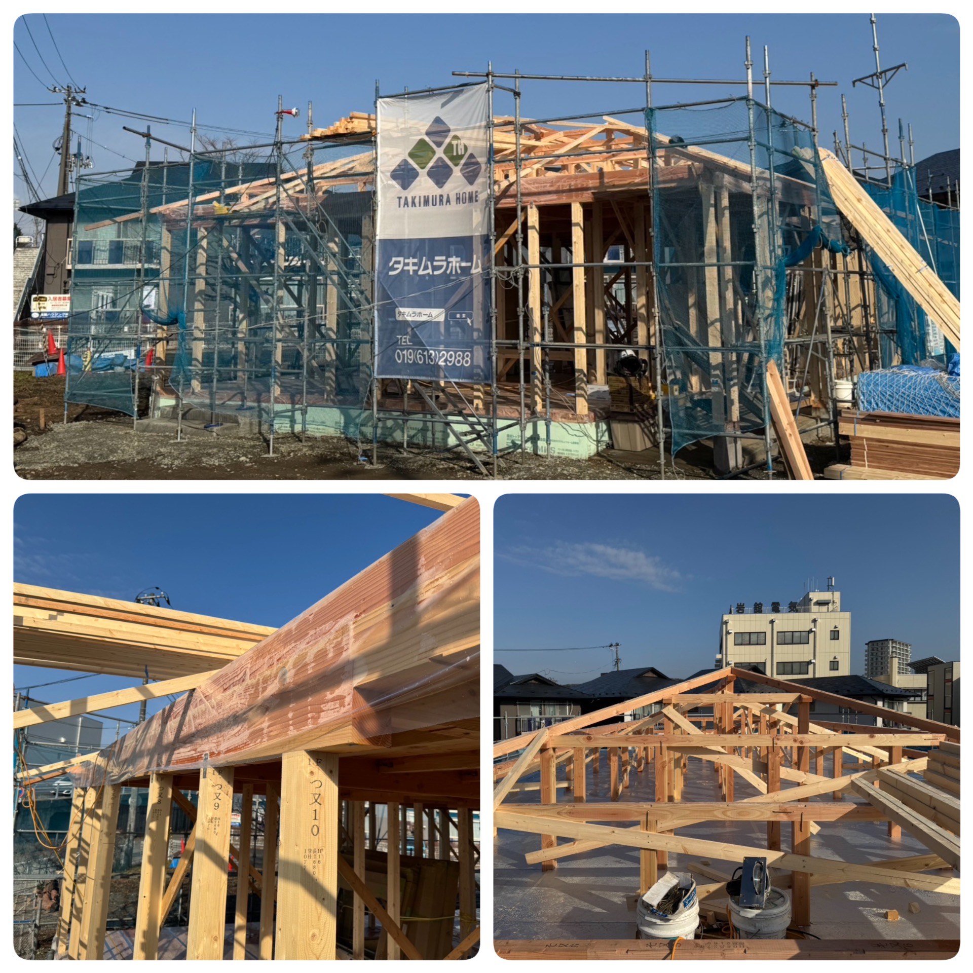 昨日の段階では屋根かかっています。画像は、ダブル断熱の屋根部分を桁上部分で取ります。天井下地と桁上の空間を有効に使え、断熱空間を抑えることができます。
