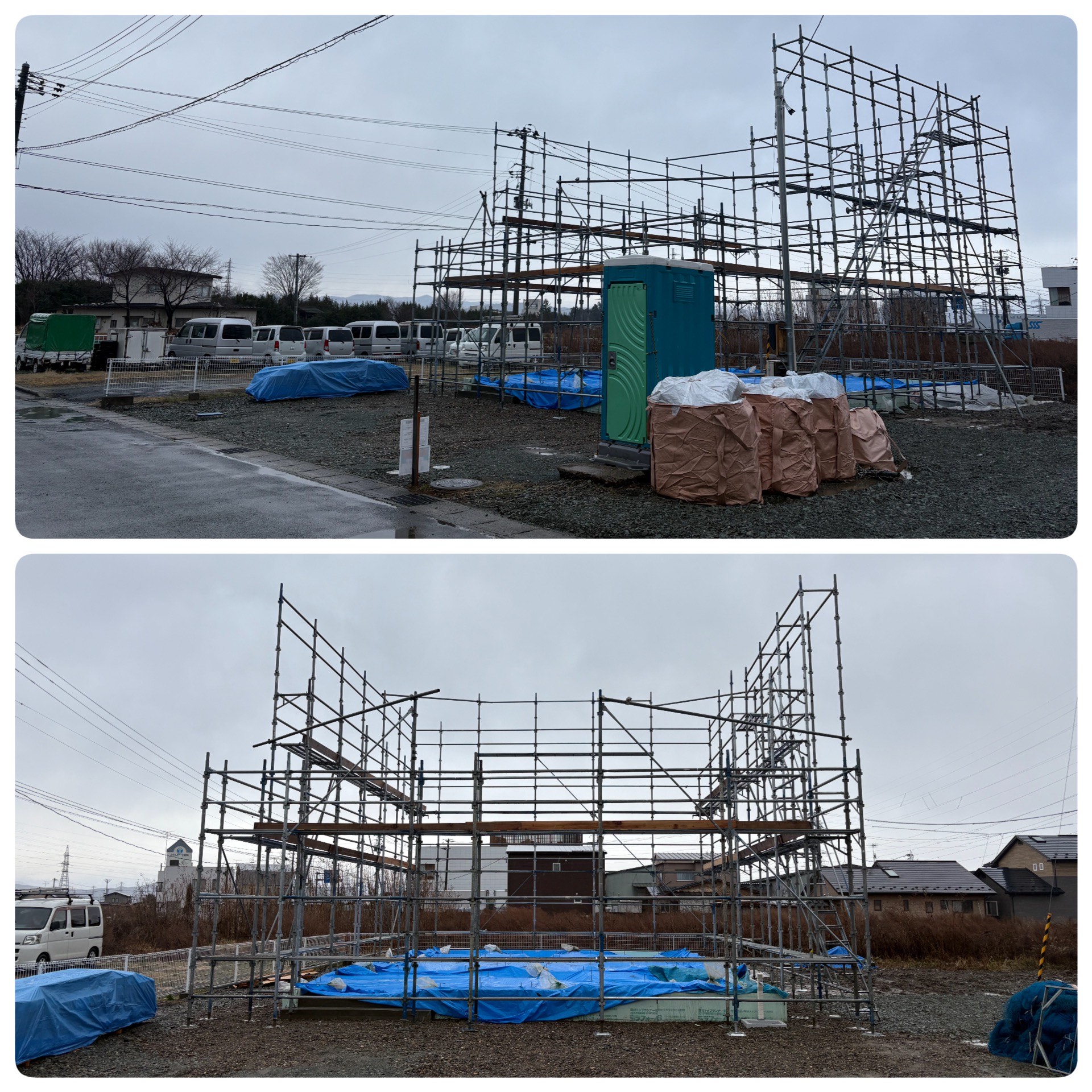 足場設置となりました。建物の大きさが何となく見えてきますね。来週には建て方となります。