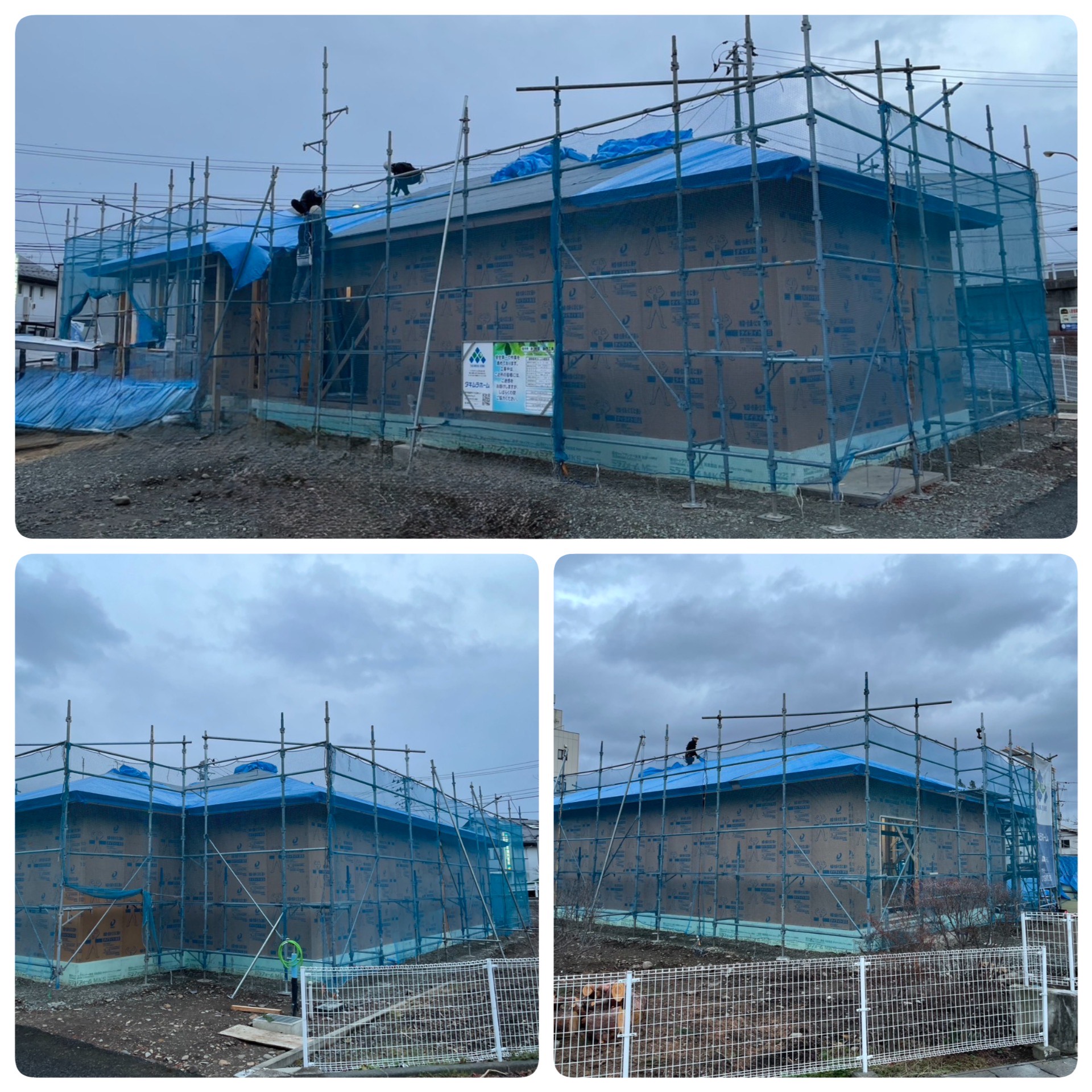 水曜日の状況なので、今日はもう少し進んでいますかね。屋根下地、外回りダイライトで施工済みです。年を越す前にサッシ付けまで終わりますね。