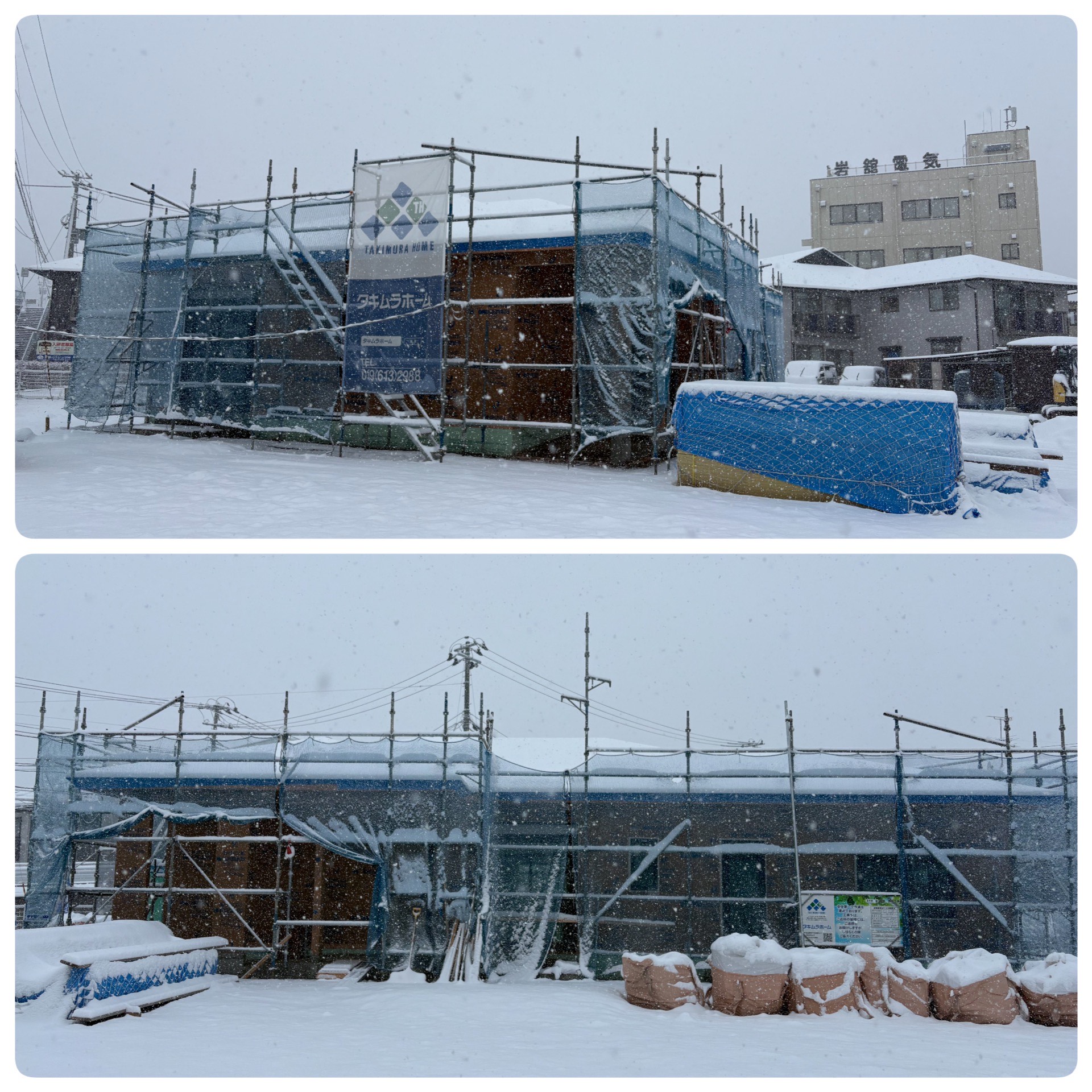 サッシの取付まで完了してます。岩手の冬の工事に雪はつきものです。春まで待って建てて欲しいという方もいらっしゃいますが、個人的には冬の大工工事は、木材の含水率が安定し、施工後の反り、割れ、収縮が起こりにくいから、構造の精度が高くていいと思います。職人の皆様には寒い中、また、日が暮れるのが早いなど「はかいかねー」ってなるとは思いますが。
