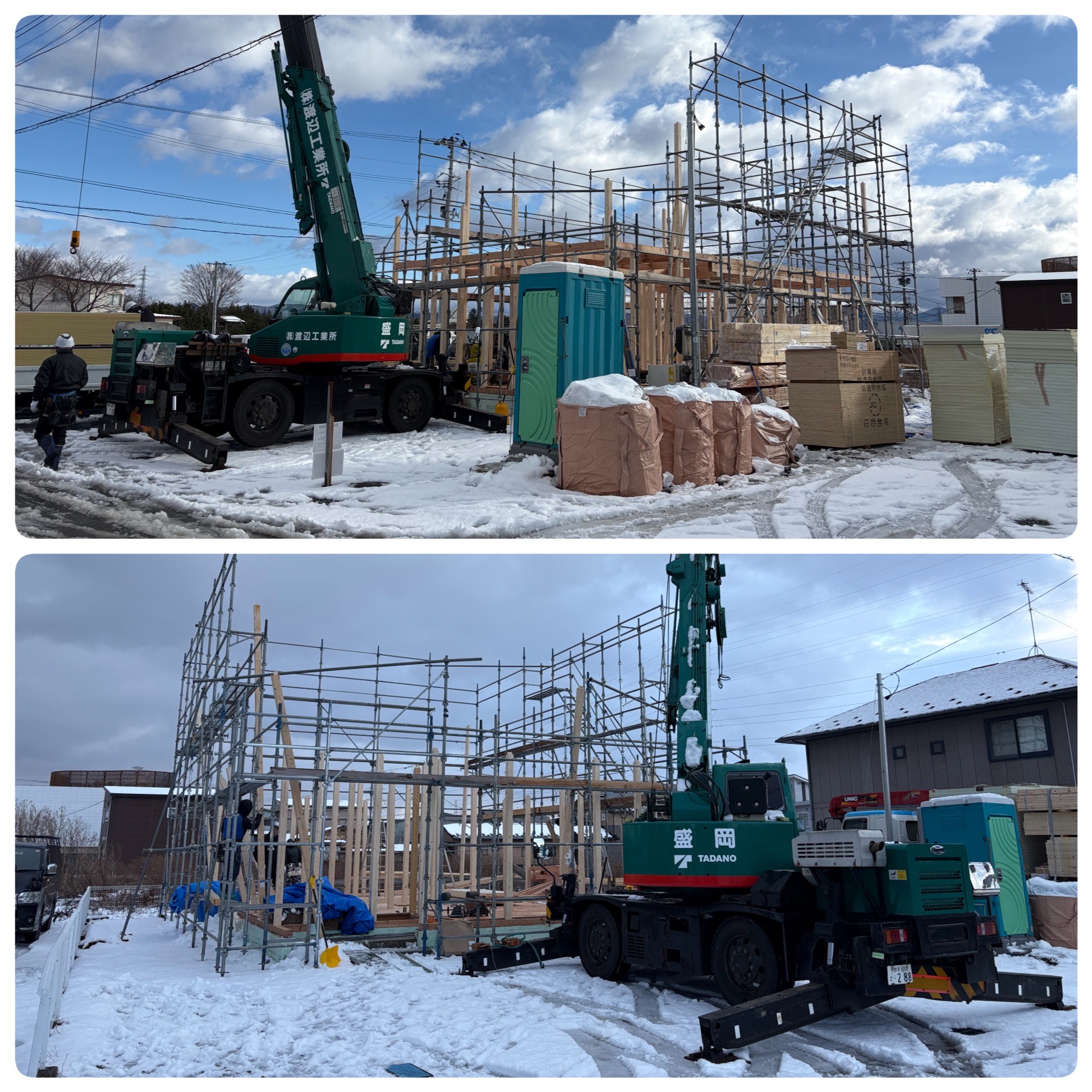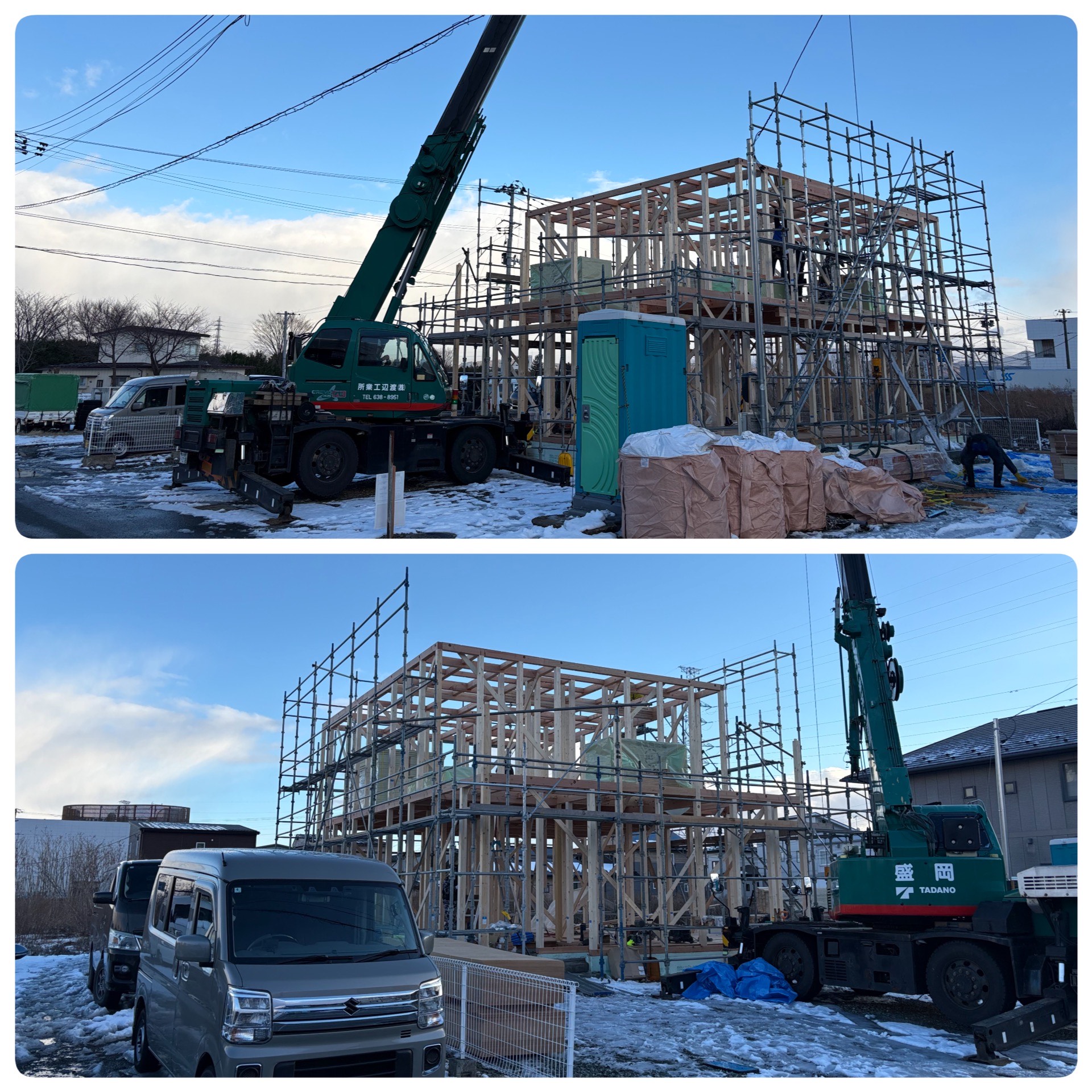 今日建て方の現場。未明に暴風雪警報で出ていたので、どうなるかと心配しておりましたが、普段は風が強い場所ですが、朝から穏やかでした。