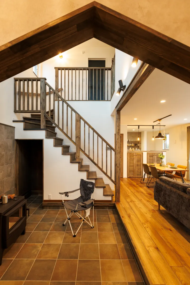 薪ストーブと吹き抜け階段が生み出す