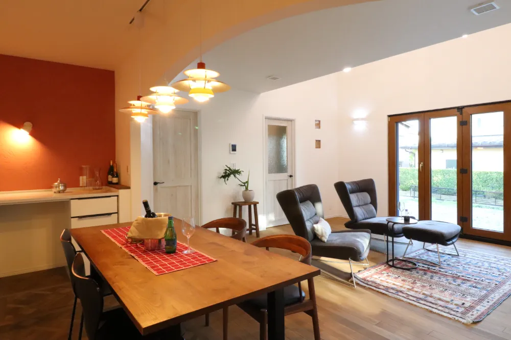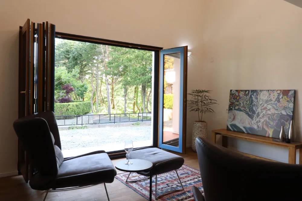 20帖のLDK。4連のフォールディング窓から溢れる太陽で明るい空間を実現。