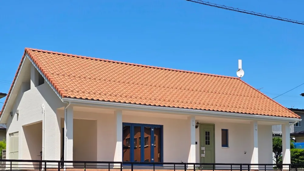 地中海の風をまとう 青い窓と瓦屋根の家