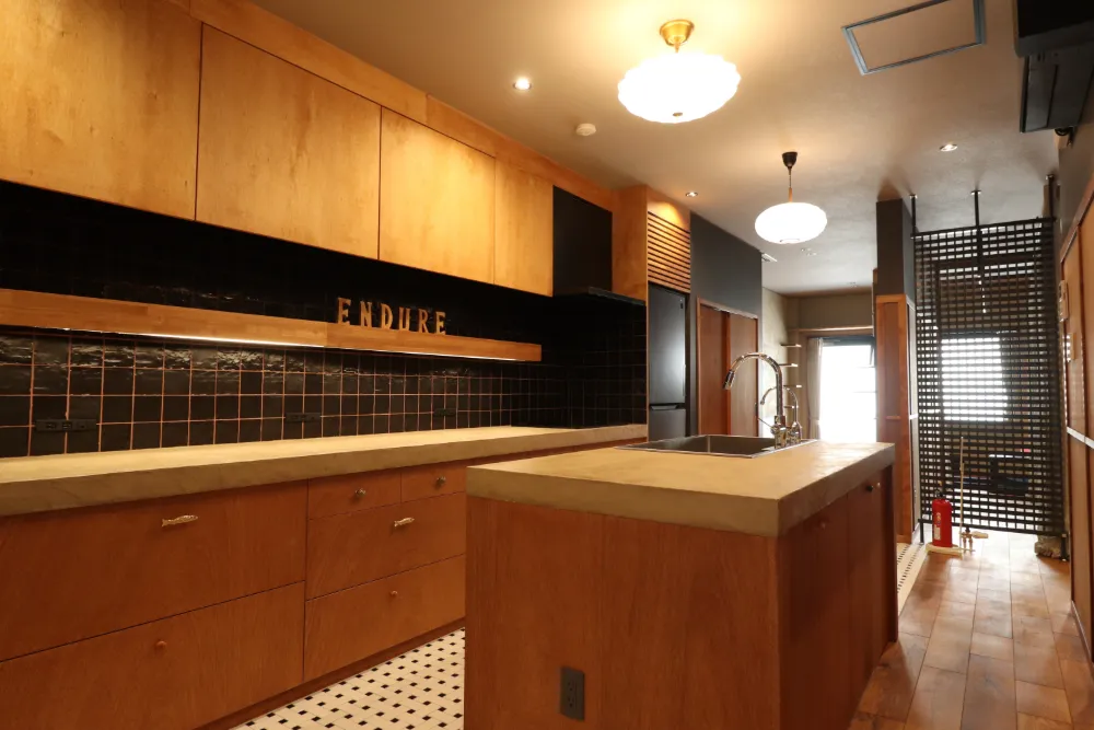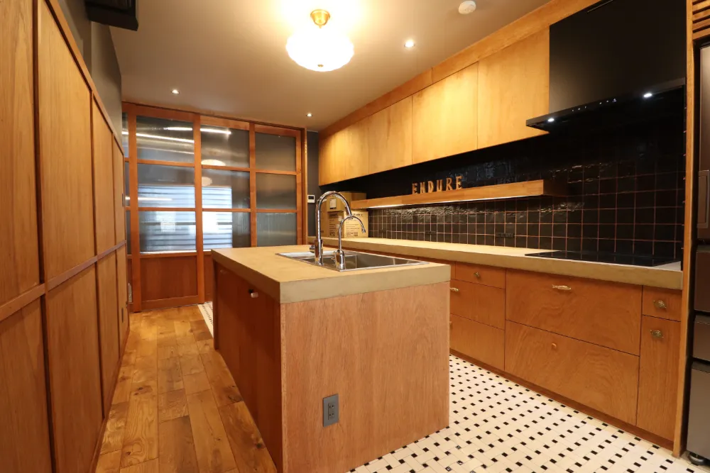 無垢の面材のキッチン、 裏面の造作カウンターもホワイトで コーディネイト!