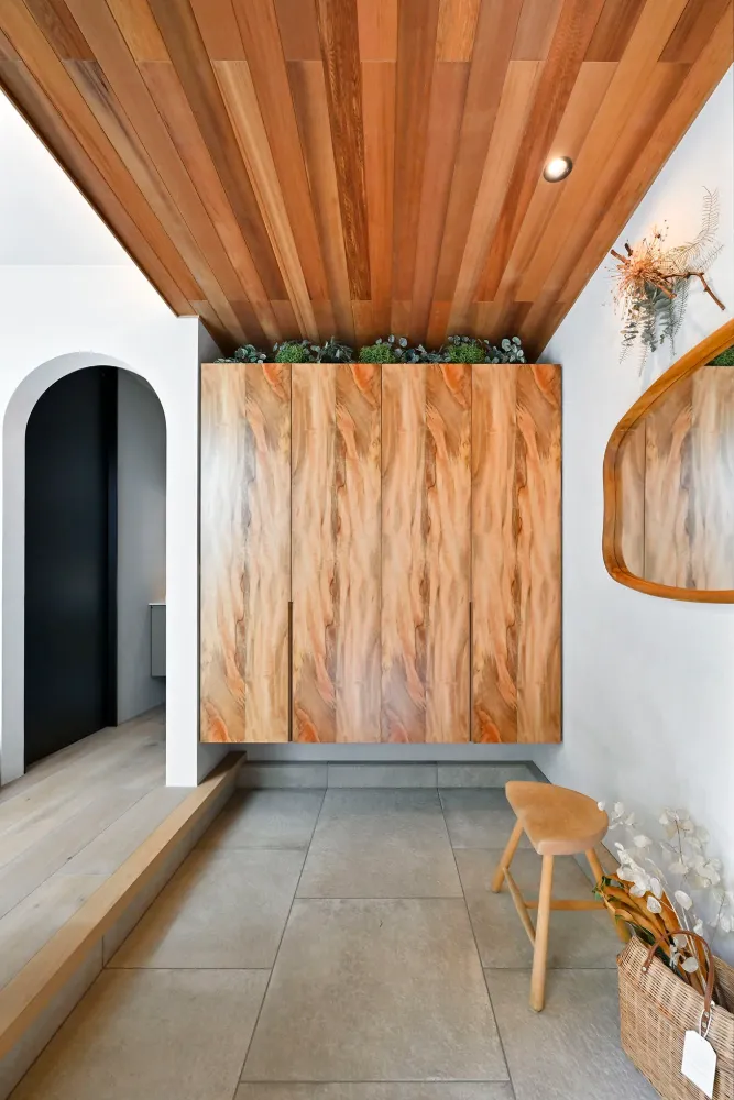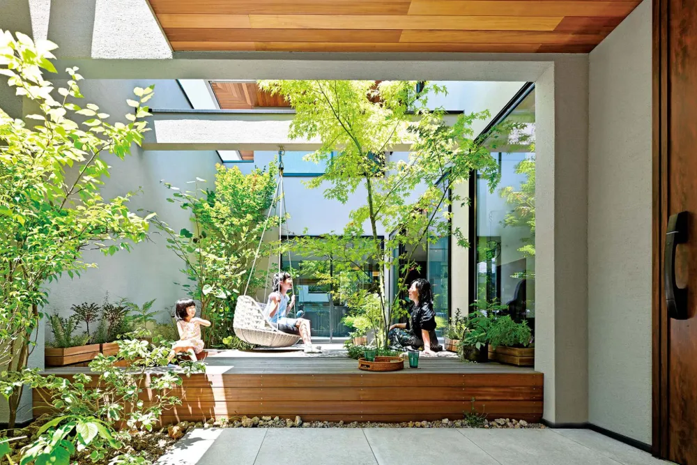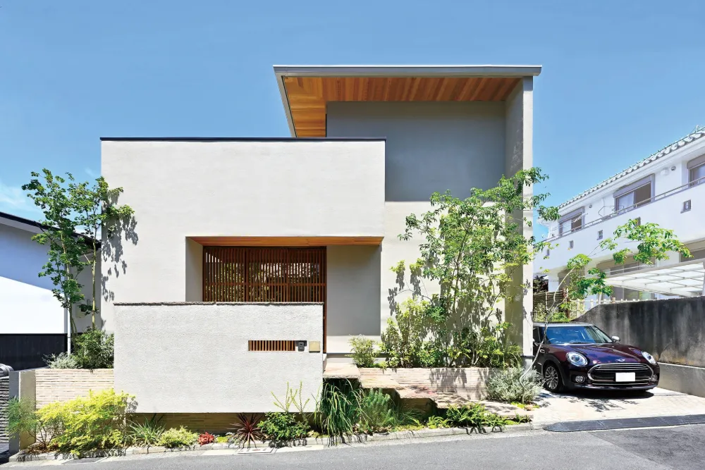 木調仕上げの軒天井が目をひきます。道路側には豊かな緑を植栽しました。