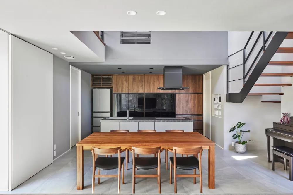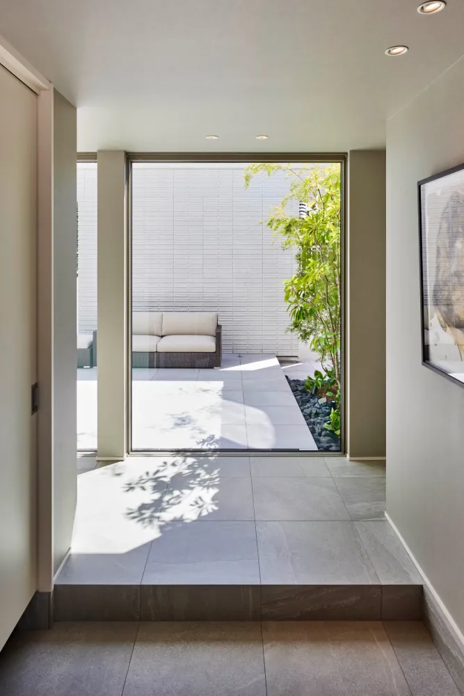 玄関を入ると正面の中庭が目に飛び込んでくる。フィックス窓を床から天井まで大きく取り、入ったときの景色を印象的に仕上げた