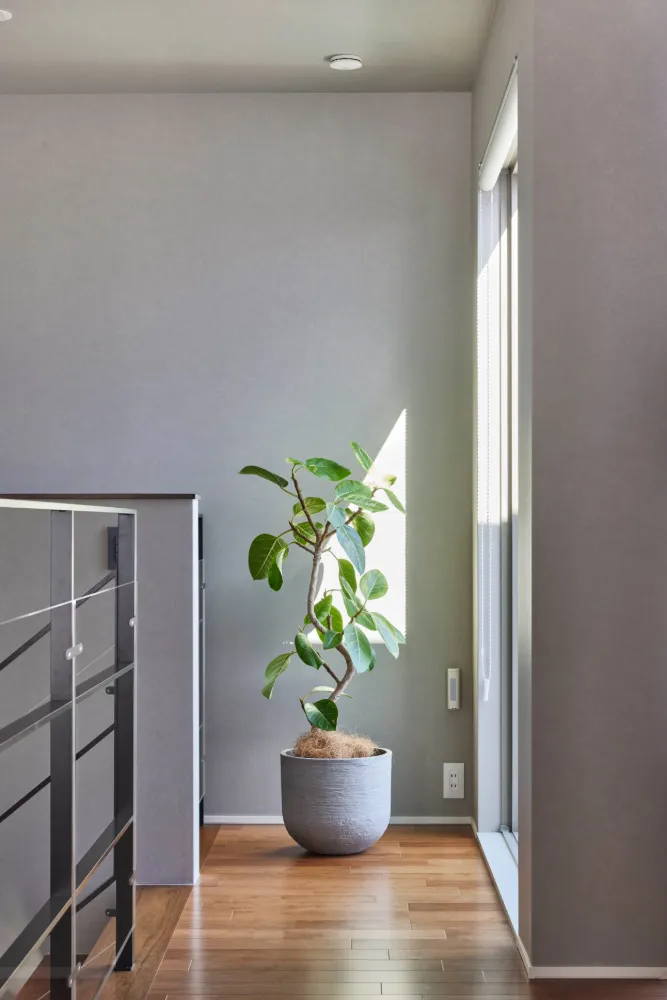 リビングの階段を上がったところにある2階のフリースペース。中庭に面して日当たりもよく、インドアグリーンを育てる場所にぴったり