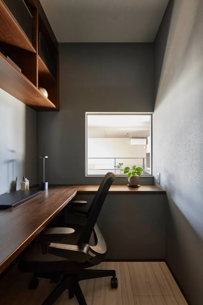 ワークスタイルの変化に合わせ、寝室の一画をリモートワークスペースに。吹き抜け面の小窓を通して家族の気配を感じることができる