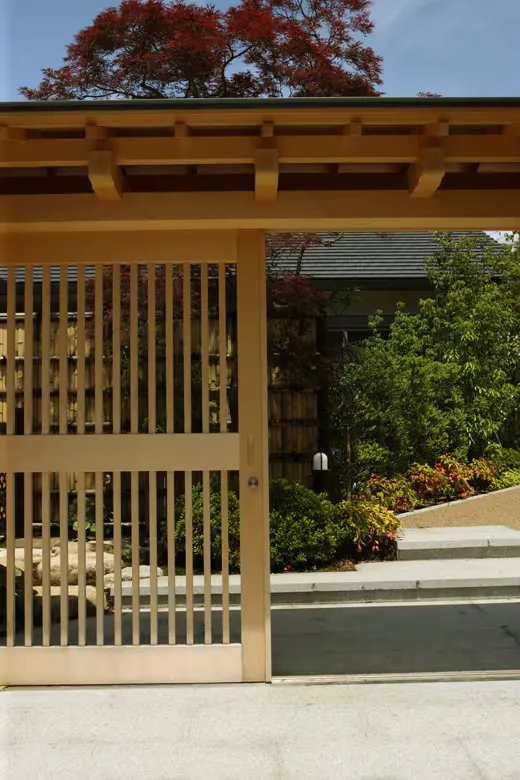 奥様のご希望で設えた冠木門が、和風の外観とよく似合う