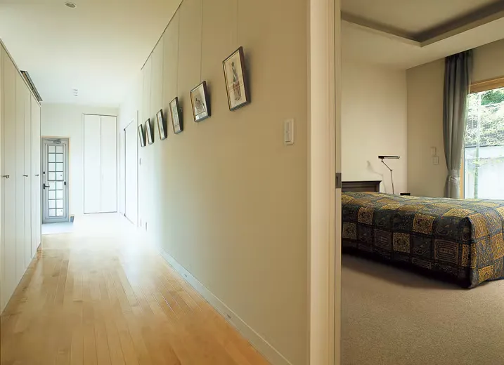 ご夫婦それぞれの寝室を設け、W.I.C.と半廊下でゆるやかに仕切る