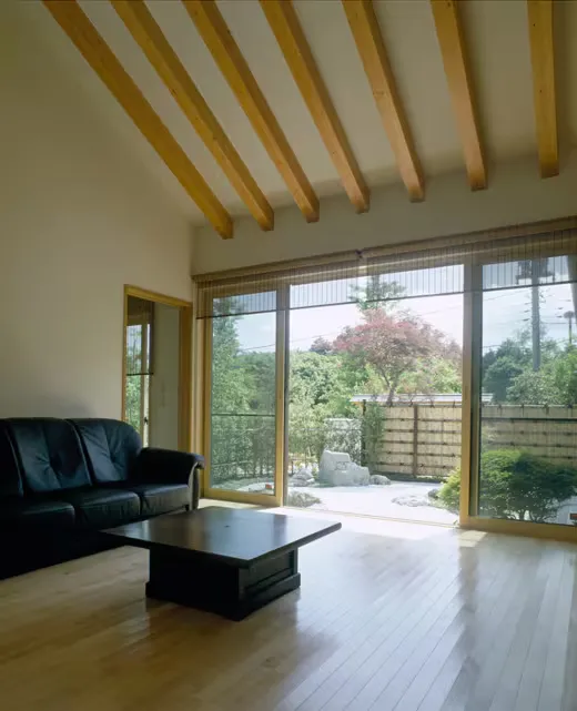 ワイドサッシがピクチャーウィンドウとなり、石庭の景観を美しく切り取るリビングからの眺め