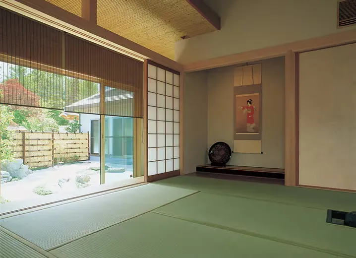 敷居、広縁、縁側天井などを竹素材で統一し、風情豊かな和室