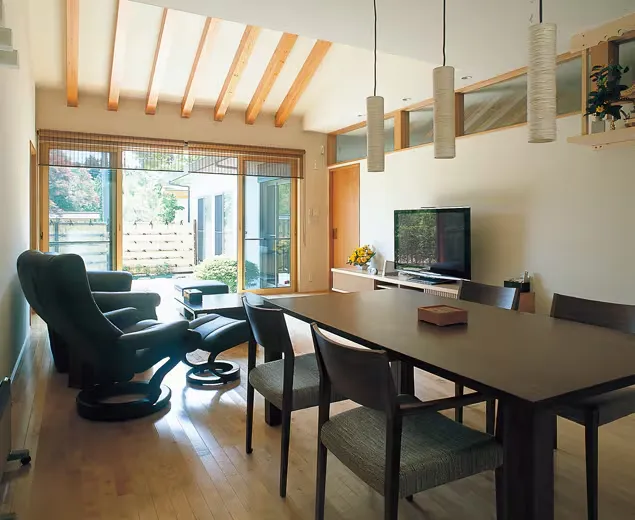 半あらわし梁のある勾配天井が外光を室内に導くリビングダイニング