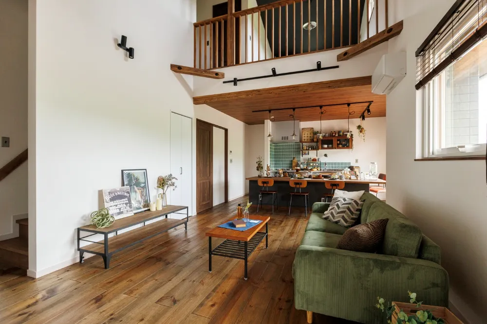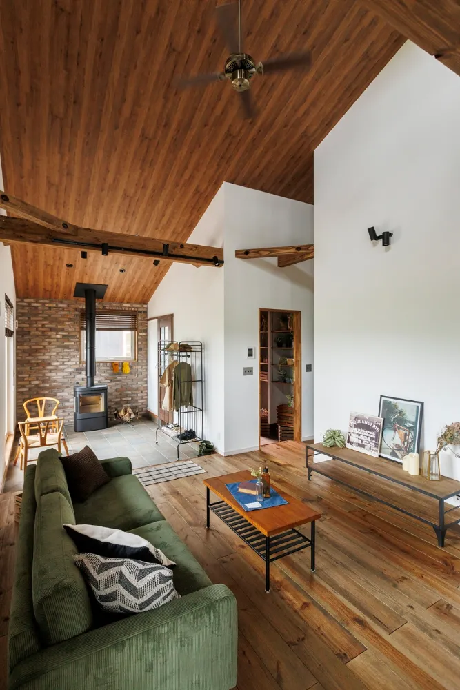 大屋根の下で薪ストーブを囲む家