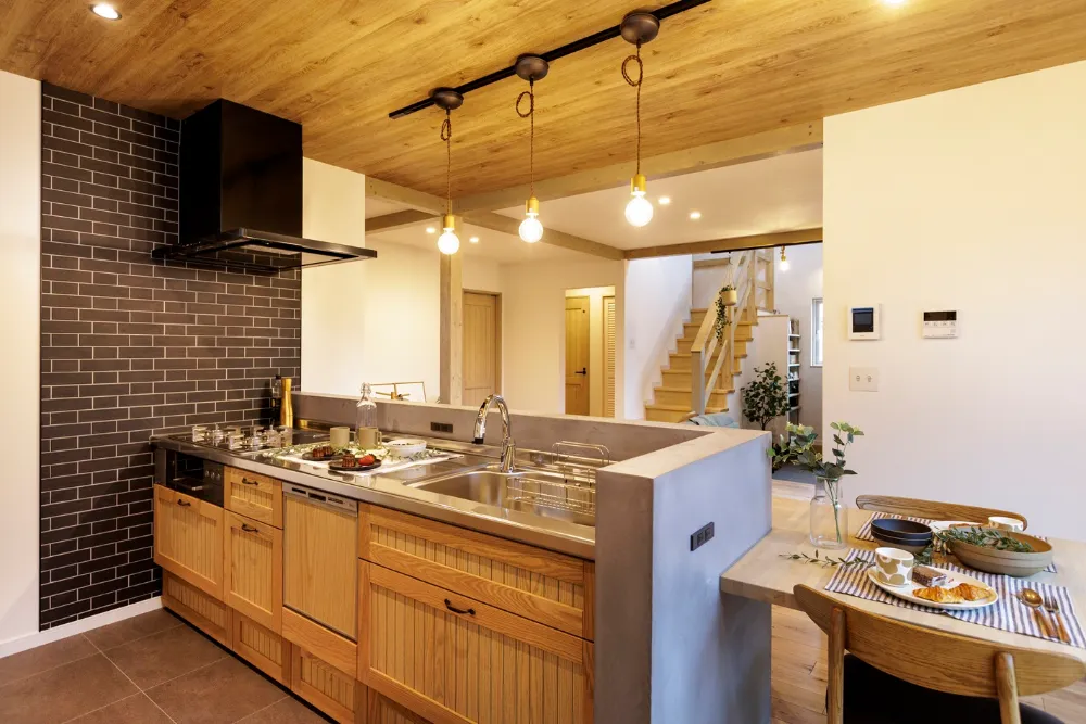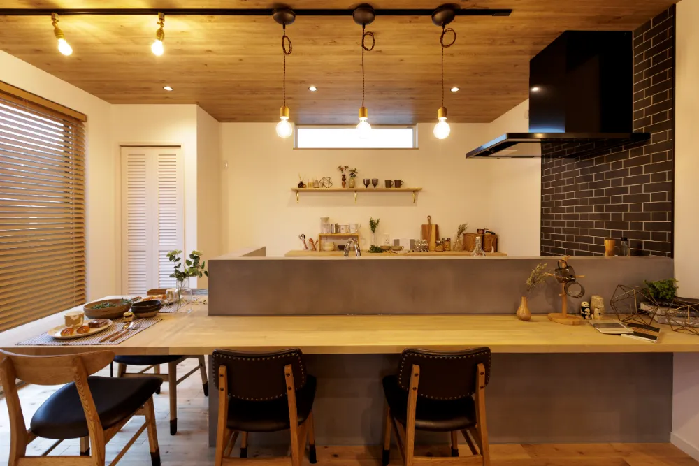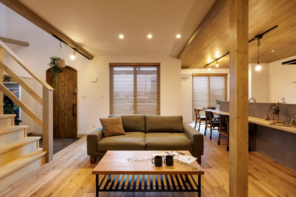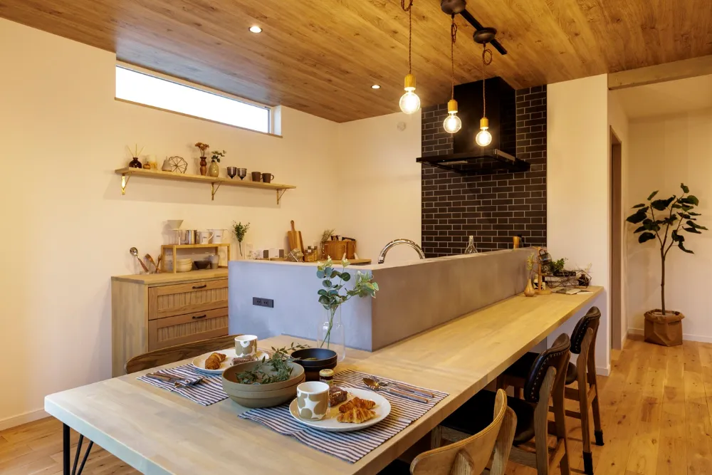 大屋根の下で薪ストーブを囲む家