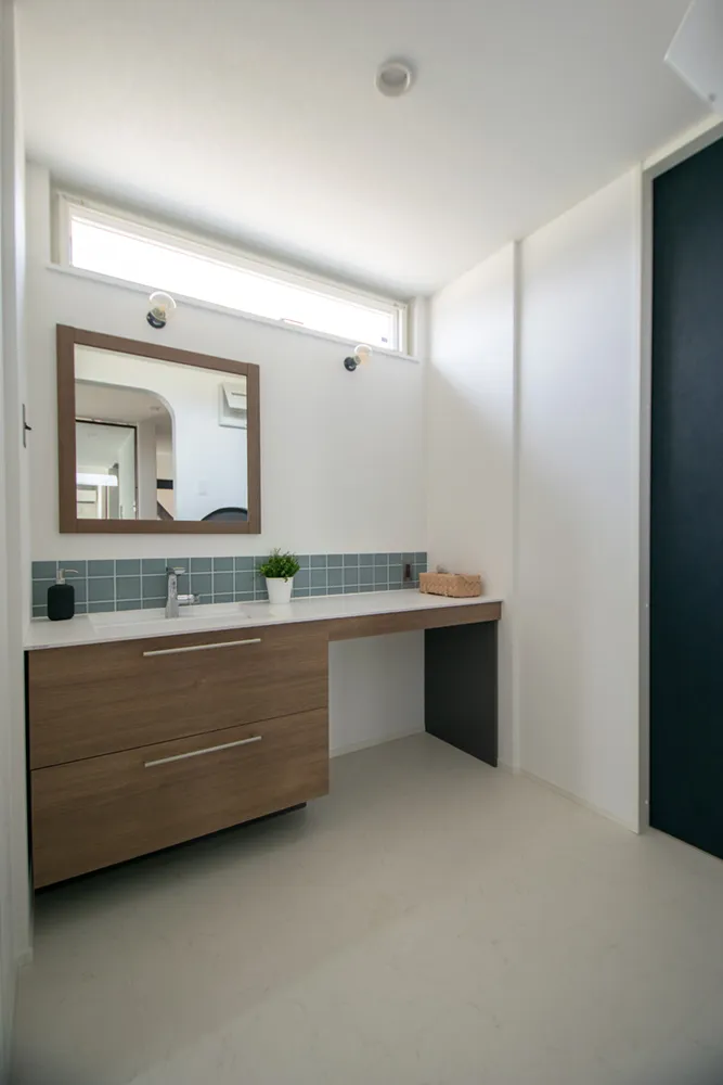 洗面台はTOTO様のエスクアを採用しました。木目調×白×タイルで清潔感があるちょっとレトロな北欧風のインテリア。洗面台に対面する壁にはアーチ型のタオルがけニッチを設けました。バーは真鍮色でグレーのアクセントクロスに良く映える取り合わせです。