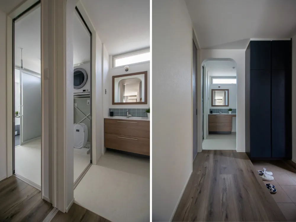 玄関→手洗い→ファミクロ→パントリーの帰宅動線だけでなく、一か所で洗濯完結動線ともリンクして家事の同時進行と時短を叶えます。