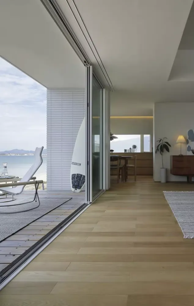 リビングは、海へ開く大きな窓側の天井高を、 デッキの軒の高さと揃え、視線がスムーズに外へと導かれる。