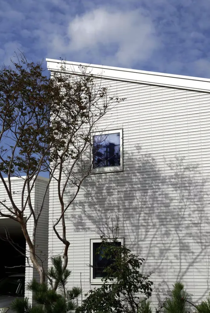 前庭には強い日差しや乾燥に強いサルスベリをシンボルツリーとして採用。 影が白い外壁に落ち、時々刻々と変化する風景を生み出す。